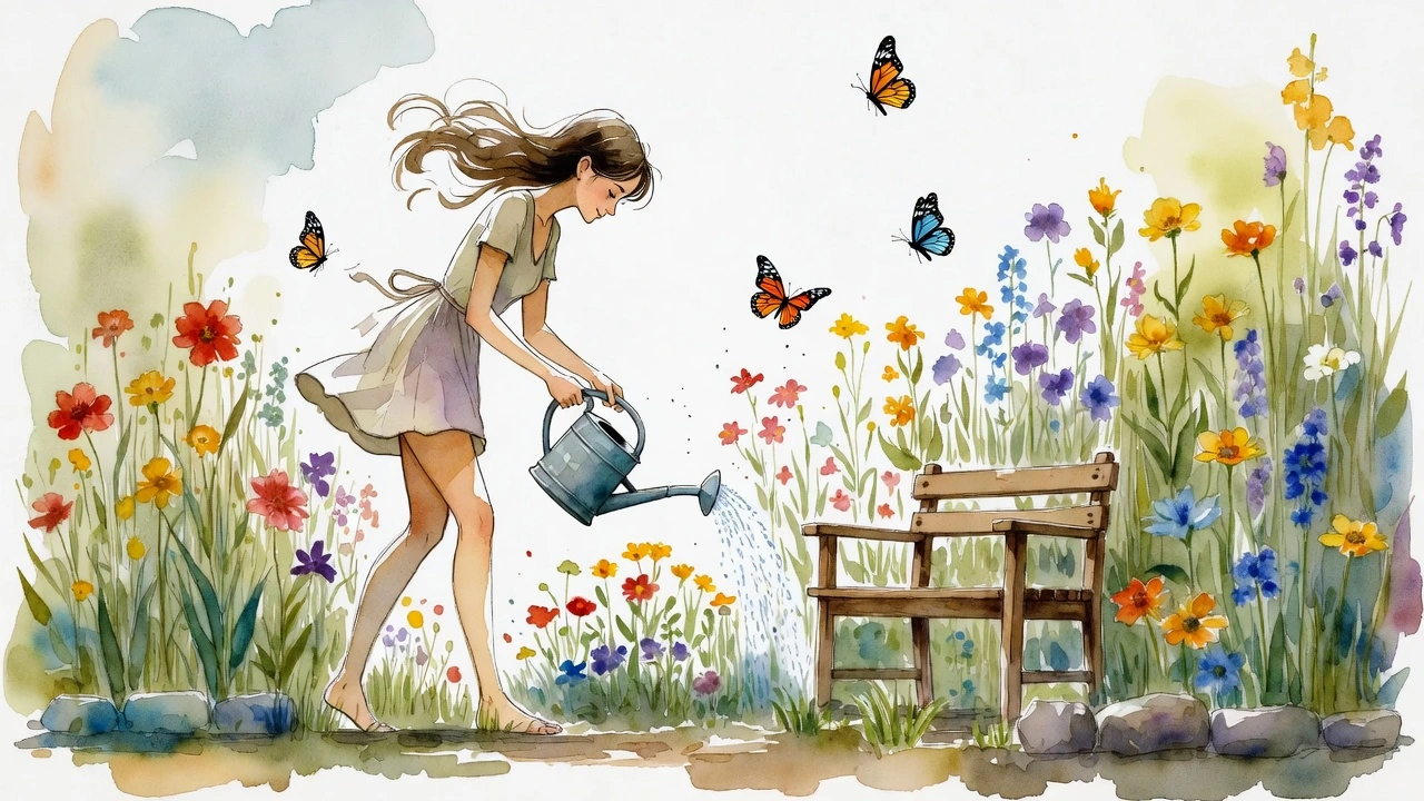 Ana tiene un jardín pequeño. Riega las plantas todos los días. También corta las hojas secas y recoge flores bonitas. A veces, ve mariposas volando. Cuando termina, se sienta en un banco y disfruta del sol. Está contenta con su jardín.